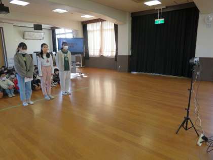 飼育委員会の子たちが3日と6日に行われるモルモットの「きなこ」とのふれあい体験について、全校に説明してくれました。