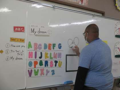 ジョシュア先生との外国語の時間を楽しみにしているみんな。イラストからその動物のスペルをアルファベットから探すゲームでは,ジョシュア先生の絵がとても上手なことが分かって喜ぶ子どもたちでした。