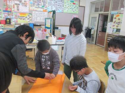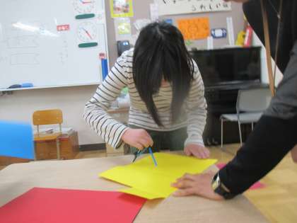 今年のこいのぼりづくりがはじまりました。目はコンパスを使って作っています。初めてコンパスを使う子もいましたが、「わあ,円ができた。」「魔法みたい。」と喜ぶこどもたち。出来上がりをお楽しみに!明日は、2年生とうろこづくりをします!