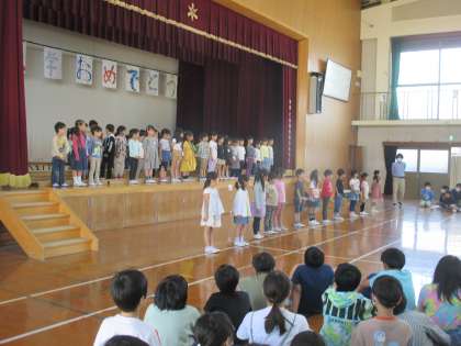 3校時に体育館で「1年生を迎える会」がありました。