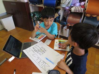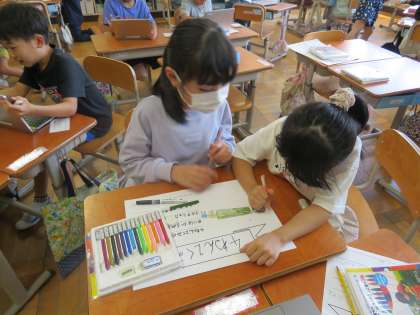 生活科の学習では,1年生へ学校を案内する準備を進めています。タブレットで撮った教室の写真をもとに,部屋の説明の文や絵をかきました。1年生にしっかり案内できるように頑張っています。