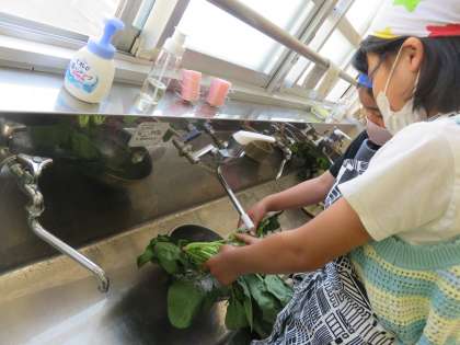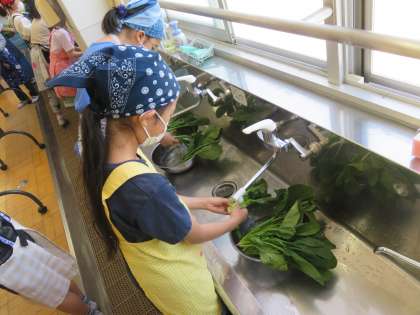 今回は「青菜のおひたし」を作りました。山の家の野外炊事を見越して、役割分担をして調理してみました。