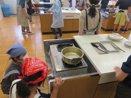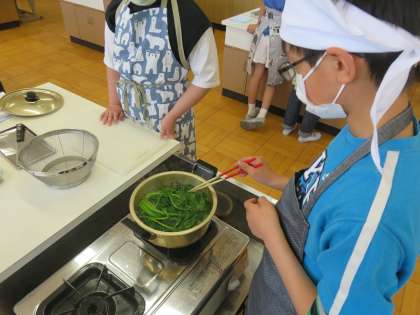 コンロでは、水を入れた鍋を火にかけてお湯を作ります。ほうれん草は「葉野菜」なので、お湯からゆでて、さっと熱を加えます。