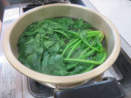 2〜3分ゆでると、みるみる色が鮮やかになってきます。ゆでる工程が終わったら、水を入れたボウルで冷まします。さいばしを使って慎重に作業しています。