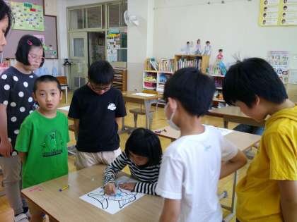 図画工作で、ぬり名人(オンリーワンの虹色うろこ)の学習をしています。ぬり方名人のやり方は、「ていねいに、しかもすばやく」。好きな色を選んで、クレパスや絵の具をぬっていきます。久しぶりの絵の具は、筆やパレットの洗い方も思い出しながらになりました。うろこに少しずつ色が入っていきます。完成が楽しみです!