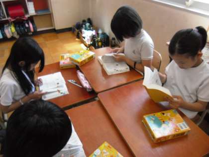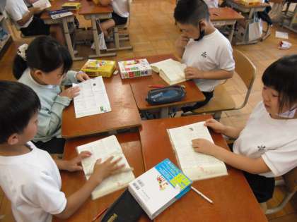 今日は国語辞典に慣れるために、グループになって、一人が言った言葉を残りのみんなですばやく調べるというゲームをしました。