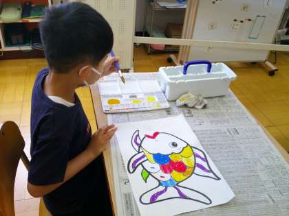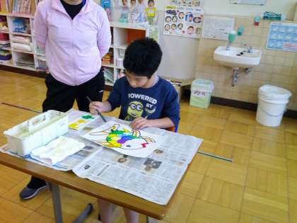 絵具を使ってウロコやひれをぬりました。3色選んで単色塗りや混色塗りを楽しみました。