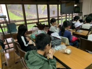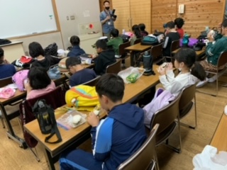 小雨が降り出しました。ほとんどの子がおなかを減らしていたので、早速お弁当をいただきました。食べ終わった時、外には青空が見えていました。