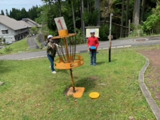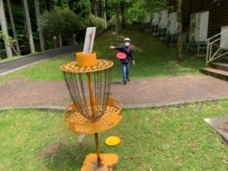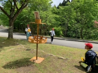 グループごとにフライングディスクゴルフのコースを周り、楽しみました。だんだんとコツが分かり、少ない回数でクリア出来るようになってきました。