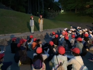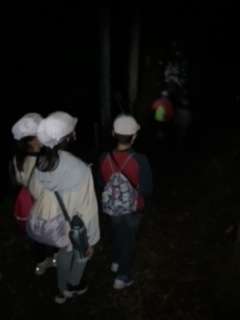 ナイトハイクです。お昼に下見をしたのと同じ道を、みんなで並んで歩きました。普段は夜の山道を歩く経験はなかなかできません。ふりかえりでは、音や匂い等、五感を使って自然を感じたことをたくさん発表してくれました。