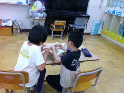 3年生が国語辞典の使い方を2年生に伝えているところです。とてもやさしい3年生。ほっこりとした2人の背中です。