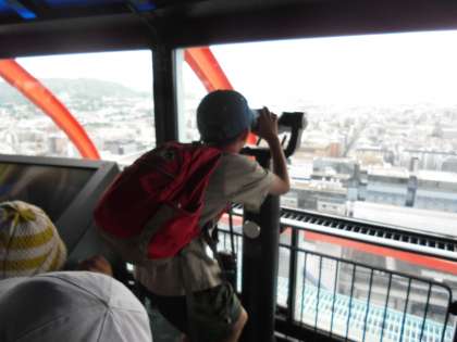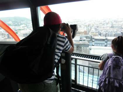 京都タワーの展望室では、双眼鏡を使って遠くの景色を見ることができました。
