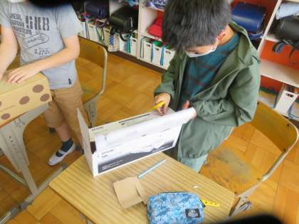 視点を変えると「物の見え方」が変わり、見える世界が変わってくるものです。今回の図画工作科は箱を使った立体の題材です。今日は箱に穴を開けて、空間に光を取り込んで見ました。