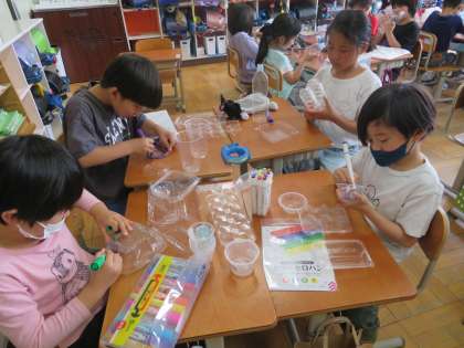 図工の学習で「ひかりのプレゼント」をしました。持ってきた材料に色をつけ、ひかりを通して、形や色をうつして楽しみました。