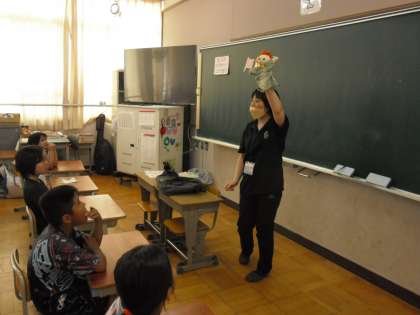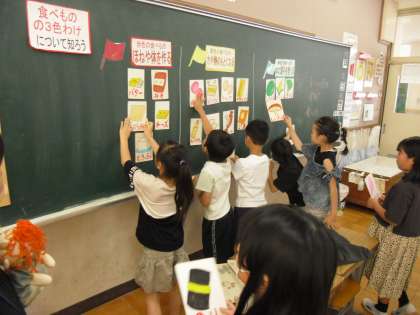 栄養教諭の早田先生に来ていただき、「食べ物の3色分け」について教えていただきました。骨や体を作る「赤」、力や熱のもとになる「黄」、体の調子を整える「緑」の食べ物をバランスよく食べることが大切だということを知りました。
