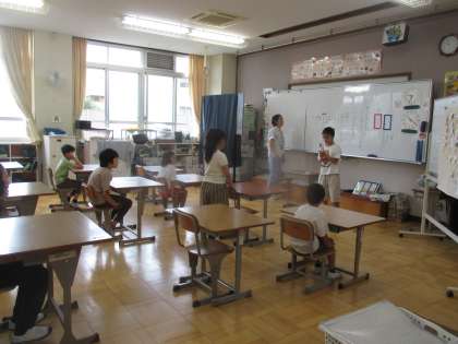 正親小学校の友達と一緒に国語の勉強をしました。友達のトレンドひらがなを当てるととてもうれしいです。いつもとは違う雰囲気にドキドキしている様子も見られました。中間休みには、一緒にしっぽ取りを楽しみました。