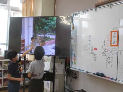 仁和小学校での「あぶないよ」の場面を実際の写真を見ながら考えました。もう一人の自分を使って、どうすれば危ない状況にならないのかを考えました。