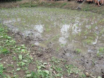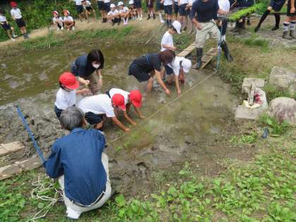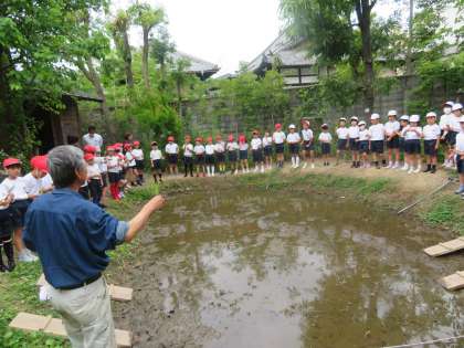 8日(木)に地域の方に教えていただきながら田植えを行いました。苗の持ち方や植えるときのコツなどを教えていただきました。田んぼの土の感触を楽しみながら,植えました。
