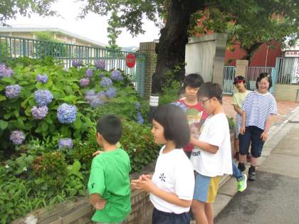東門できれいに咲いているアジサイを描きました。朝、みんなでアジサイツアーをして「ハート形のアジサイがあるね。」「色が違うね。」「きれいだねぇ。」「家の近くで赤色のアジサイをみたよ。」等楽しい声が聞こえました。