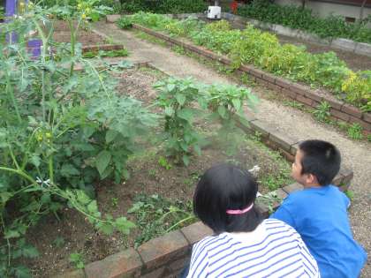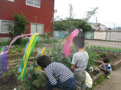 雨のおかげで野菜もすくすく育っています。「葉も茎もおおきくなってるね。」「実も大きいよ。」口々に言います。かかしの代わりに、あまったカラービニール袋でかかしをつくりました。