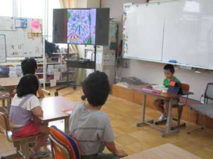 友達が国語の教科書で音読をします。毎日音読を丁寧にしているので、文節で区切っていてとても聞きやすいです。2年の国語の教科書から,「迷子の子どもをさがしています。白いぼうしにリュックサックをせおっています。私はどこでしょう。」という問いに、画面を見ながら一所懸命さがしています。