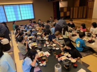 おまちかねの夕食です。楽しそうに話しながら、たくさん食べていました。中にはお茶で乾杯をしているグループもありました。