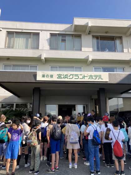朝食を済ませ、退館式を行い、宮浜グランドホテルを出発しました。