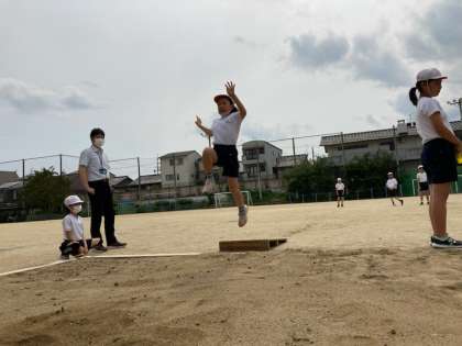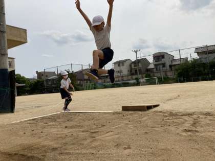 8mを超えるような世界のジャンパーのフォームを見て、上半身や空中姿勢をイメージしたり、助走距離や出だしの足を調整したりして記録に挑戦しました。