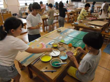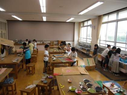 その後、筆や指、ローラー、ハケ、網などを使って、ダンボールにさまざまな模様や絵を描きました。