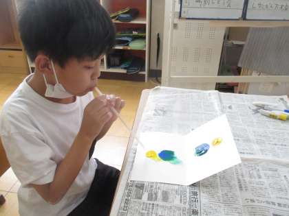 好きな色の絵具を4色選び、画用紙の片方にたらしました。画用紙を半分におりたたみ、ひらいてみると素敵なもようのできあがり。少し水を垂らしてストローで吹くとまた違った模様に!最後は、半紙にうつしました。