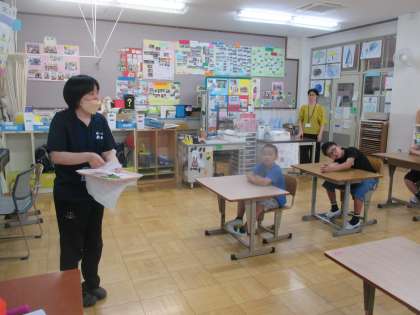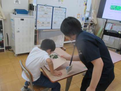 栄養教諭の早田先生が、今日の給食献立に入っている素敵な〇〇〇をもって、なかよしに来てくれました。教室にふゎっとおなかがすくような香りが漂いました。トマトによく合うあのハーブです。そう、バジル。実際にバジルの葉をかぐとおなかがすいてきました。給食の洋風そぼろごはんでは、「これはピーマンかな、バジルかな。」とよく見て考えながら食べている子どもたちでした。目でも舌でも味わうって素敵ですね。