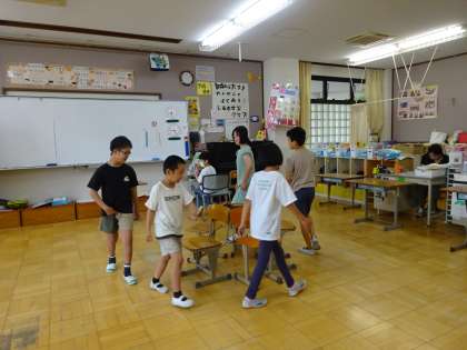 高学年が司会進行をして、お楽しみ会を2回に分けて行いました。1回目前半は、いす取りゲームでした。歌も友達が歌います。サチアレやおちゃらかほい、カエルの歌等、いつも音楽や学活で取り組んでいる歌が自然と出てきました。とてもほっこりした空気が流れていました。