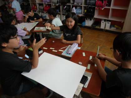 「もし山小屋で三日間、自然とふれ合いながら過ごすなら、どのようなものを持っていけばよいか」というテーマで、友だちと話し合いました。グループで5種類しか持っていけないというルールがあるので、どのグループも白熱した議論が行われていました。