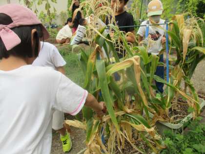 ポップコーン用のトウモロコシの収穫や発芽したほうれんそうの種を土に植直しました。ポップコーンも酷暑を感じていたようです。