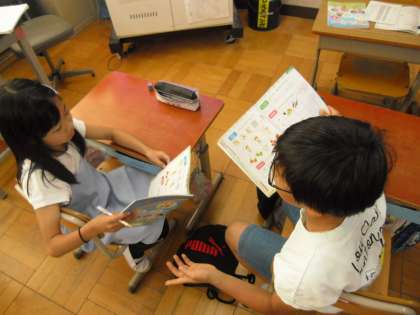 また、「ステレオゲーム」をして楽しみました。先生が「What fruit do you like?」と聞いたことに対して、前に出た3・4人が一斉に答えを言い、みんながそれを聞き取ります。