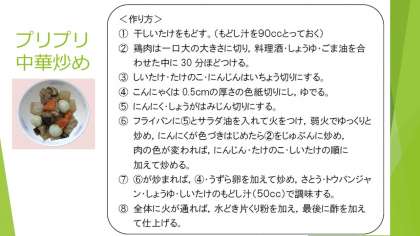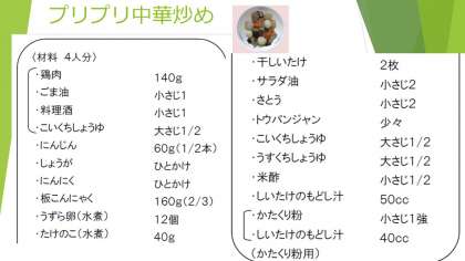 プリプリ中華いためは、カレーに続く人気の献立です。プリプリとした噛み応えがある食材を使った、よく噛むことをねらいとした献立です。