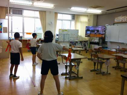 ロイロノートにスポーツフェスティバルの練習の写真を取り込んで、今日がんばったことや次何をがんばるかを発表し合いました。その後、動画を観ながらの楽しくダンスタイムでした。