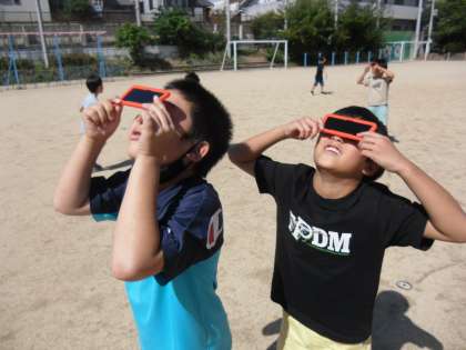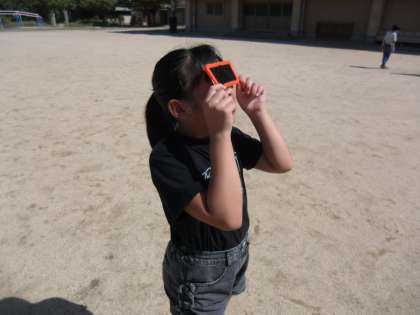 今回は「遮光板」を使って、太陽の位置と自分の影の位置の関係を調べました。