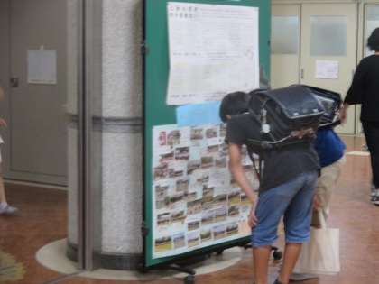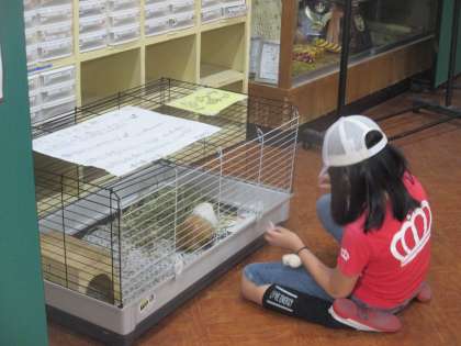 エントランスの一場面です。なかよし学級の手作り新聞を読む子、図書委員のみんなが担当した図書ブースで本を読む子、夏休みを終えて帰ってきた仁和の人気者ハムスターの”きなこ”を見守る子、ほっこりする風景です。