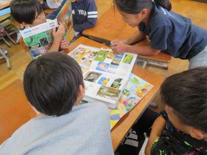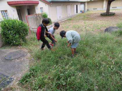 生活科の学習で、小さな生き物たちを探しにいきました。お世話の仕方をしらべ、教室でしばらく一緒に過ごします。
