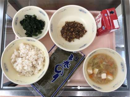 肉みそ納豆は、一年に一度の献立です。納豆だけでなく、牛ひき肉にたまねぎ、京野菜の九条ねぎも使用し、にんにく・しょうがや赤みそでご飯によく合う味付けです。