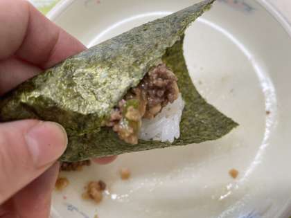 食器に海苔を置き、ごはんと肉みそ納豆をのせ、海苔で巻いて食べます。