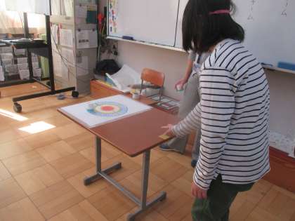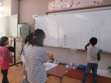 今日は、紙コップを使ったカーリングに挑戦しました。まずは、どんな遊びなのかやってみようということで、大きめの紙コップが使いやすいか小さい紙コップが使いやすいか等、実際にやってみて考えました。小さい紙コップの方が扱いやすいことが分かり、円を目指して指でコップをはじいていきました。ルールもその都度確認、訂正しながら進めました。