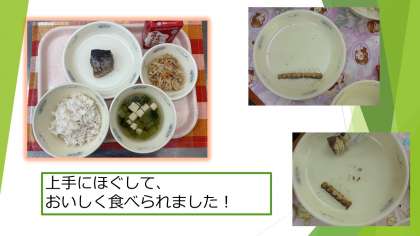 1年生の教室では、「上手に食べられたよ!」「大きな骨だけになったよ」「ご飯によく合う味でおいしいね」と、きれいに食べて、骨だけになったお皿を自慢げに見せてくれました。1学期よりも、さらに上手に食べられるようになっていました。