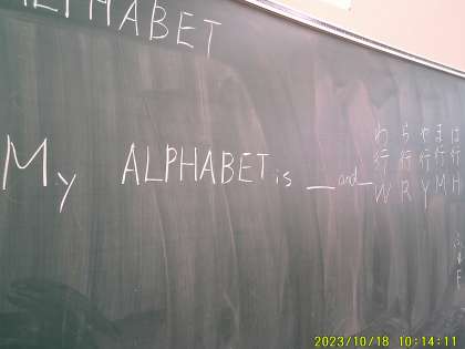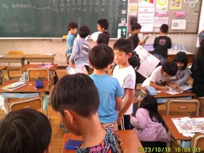 今日の外国語の学習では、自分の名前のアルファベット(イニシャル)をみんなと交流しました。同じアルファベットの子がいた時には、「同じや!」とうれしそうにしていました。