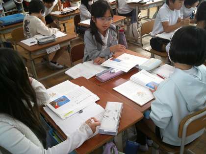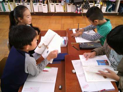 今日は文章全体の組み立てについて考えるために、「はじめ」「中」「終わり」が何段落に当たるのかを班で話し合いました。