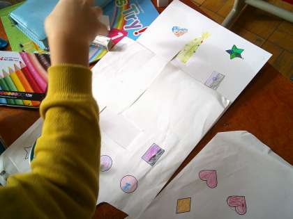 今日は学習のまとめとして、色や形のカードを使ってグリーティングカードを作りました。