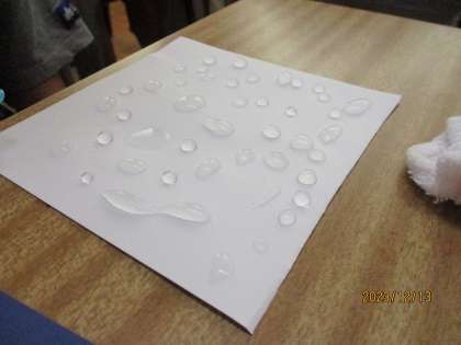 今日は水の性質について意見を出し合い、使う量や垂らし方によってどのように変化するのか確かめました。