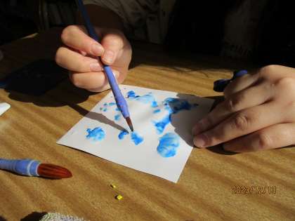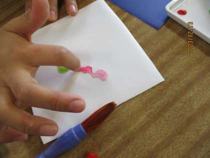 筆やスポイト、指などを使いさまざまな方法で色付けを楽しんでいました。