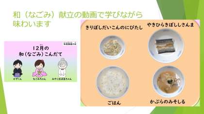 13日は、和(なごみ)献立でした。和食のおいしさを特に味わう献立の日です。動画で昔からの食べ物や、旬の食材について学びながら味わいます。